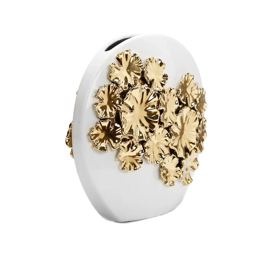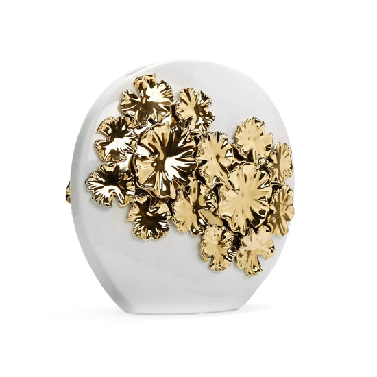 Description: We are in love with our gold floral cascading vases! If you are looking for a unique piece that can be styled in multiple ways? Then this is a must-have item! The white base enhances the bold 3D gold floral on top! Style with faux florals or this vase is stunning on its own.