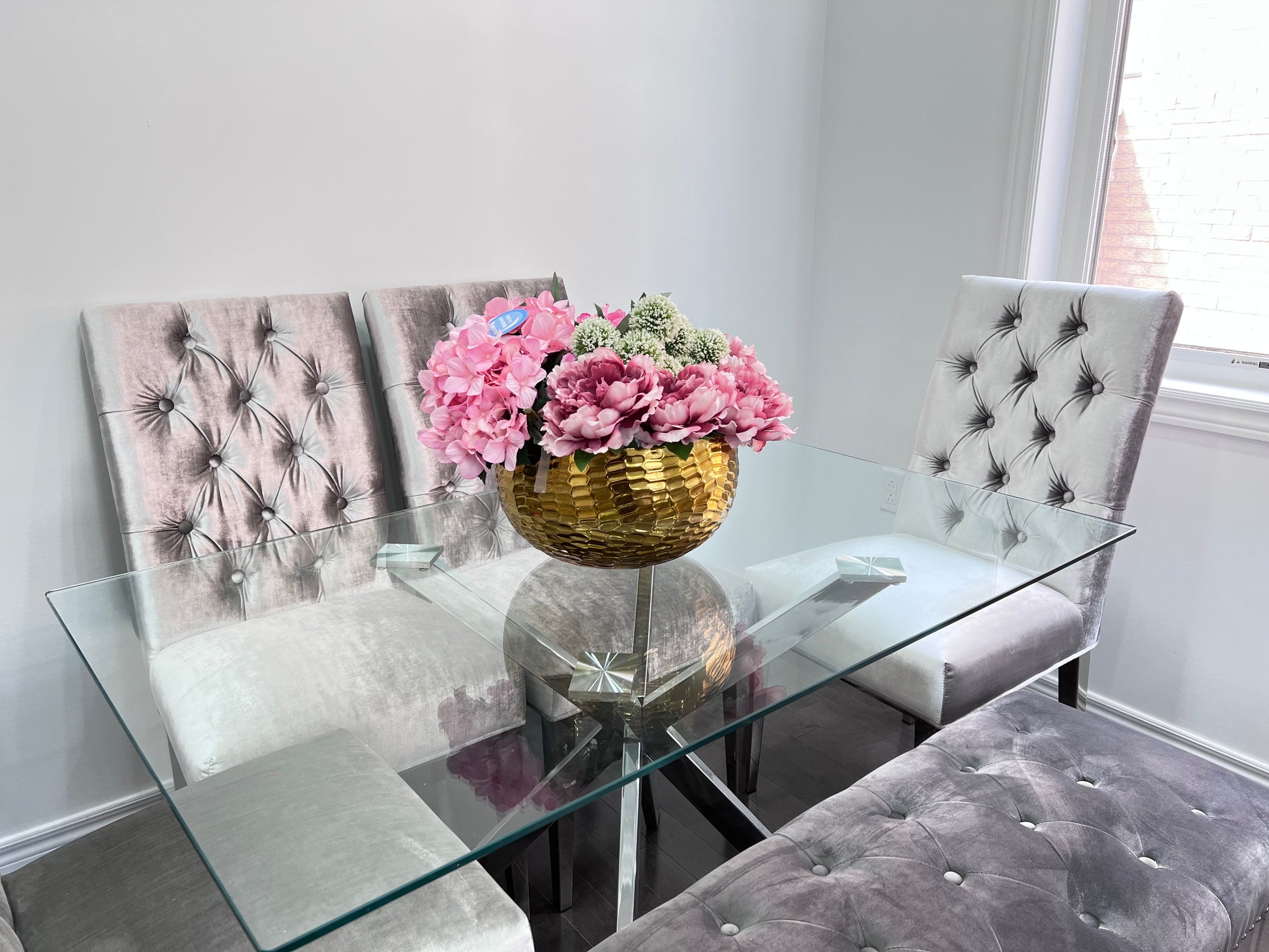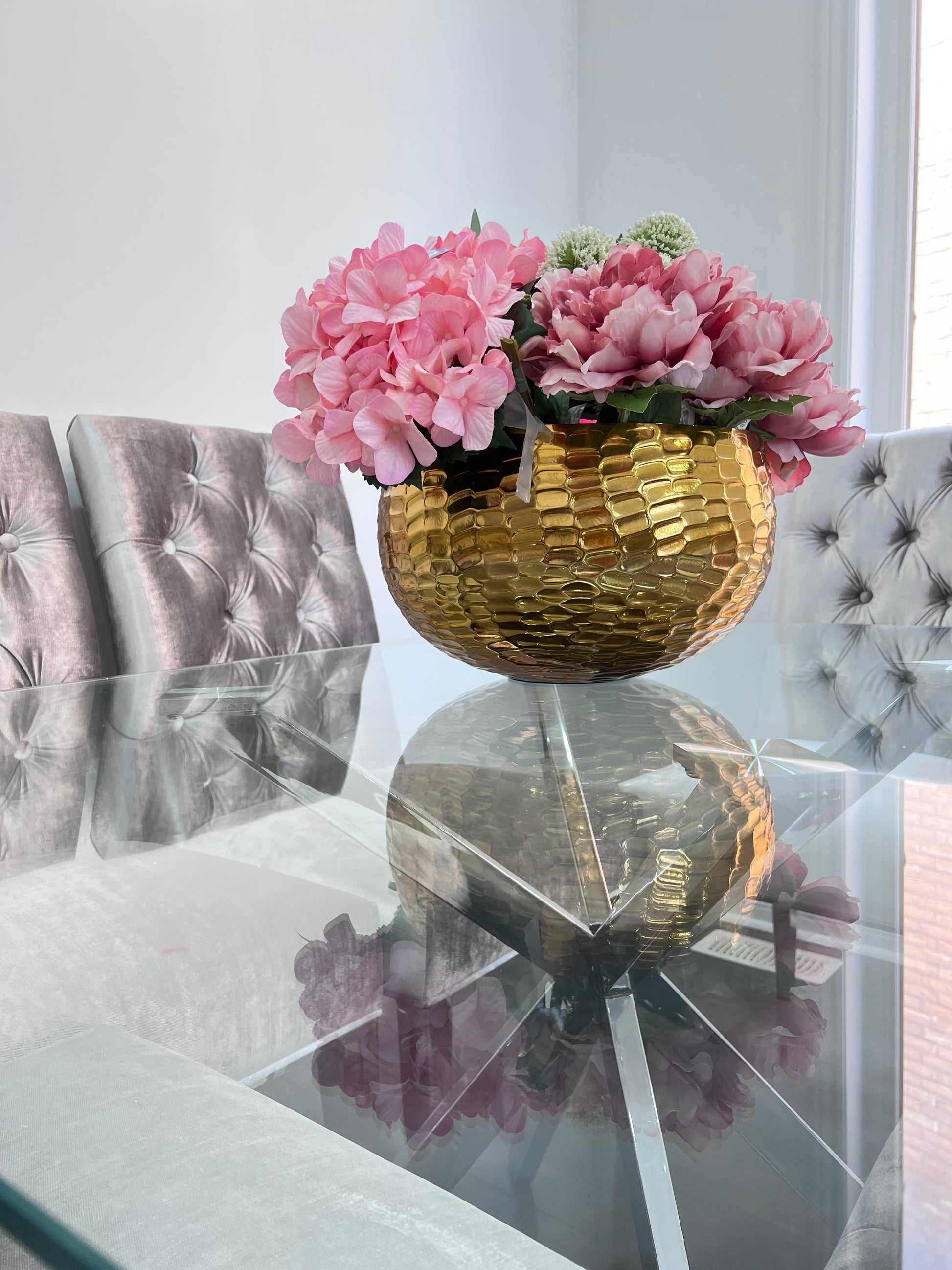 This oversized bowl is a statement maker and a favorite of our customers. It features a gold textured pattern and is deep enough to be used as a vase.