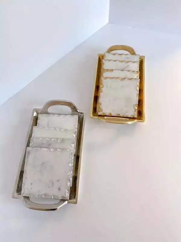 Description: These beautiful marble coasters are a perfect accent for your coffee table! Complete with a hammered texture edge and a metallic finish!