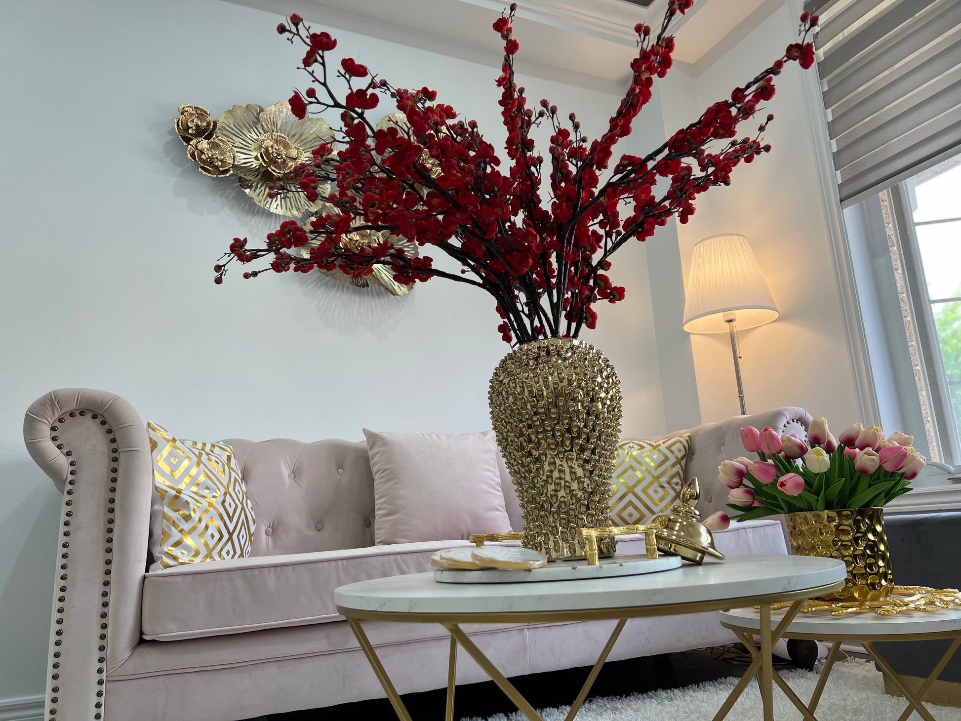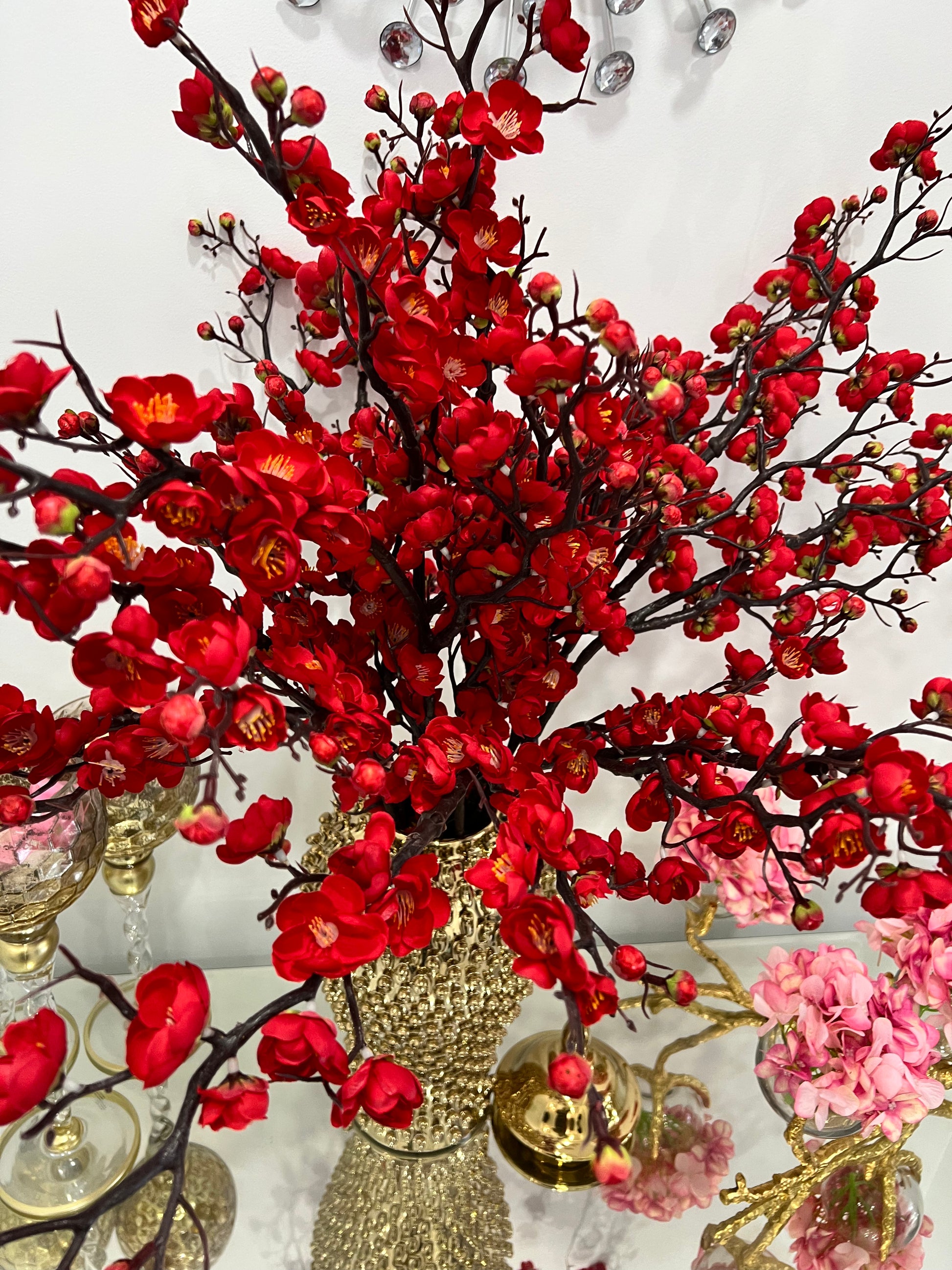 Description: This tall branch stem features stunning plum blossoms. These are perfect to style in your tall vases and ginger jars all over your home.