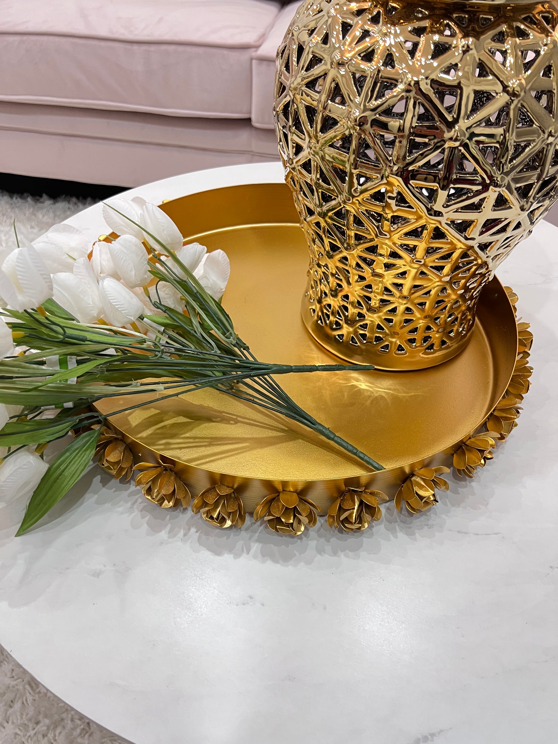 This round metal tray is a unique base for your tabletop decor! This tray features a metal base and floral details on the edge to add a perfect pop of texture!